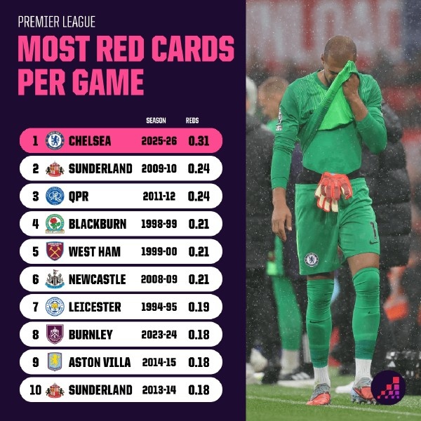 在赢下世俱杯冠军之后,切尔西的新赛季被很多人寄予厚望,没想到他们却跌入了“红牌陷阱”。他们在英超前13轮拿到了4张红牌(场均0.31张),这个效率如果保持下去,甚至可以创造英超新纪录。